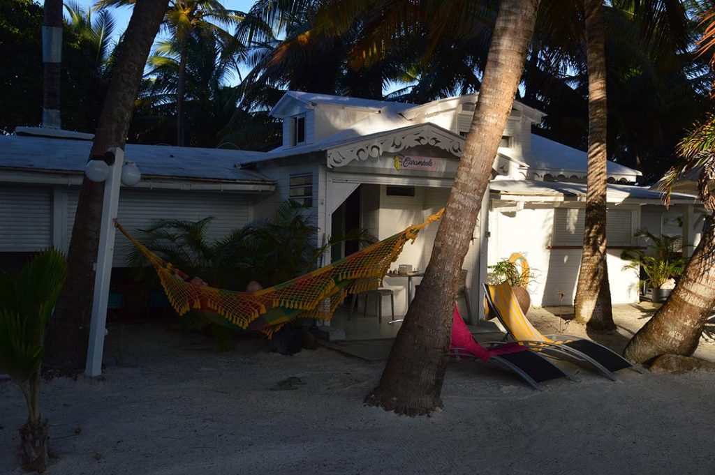 Gites Maracudja: Ein kleines Gartenbungalow in Saint Francois. Insgesamt vermietet die Gastgeberin sechs Bungalows unterschiedlicher Größe für 2 bis 6 Personen. Eine kleine Outdoorküche, gemütliche Terrasse mit Hängematte und einem großen Pool für alle Gäste nebst kleiner Beach-Bar lässt sofort karibische Urlaubsfeeling aufkommen.