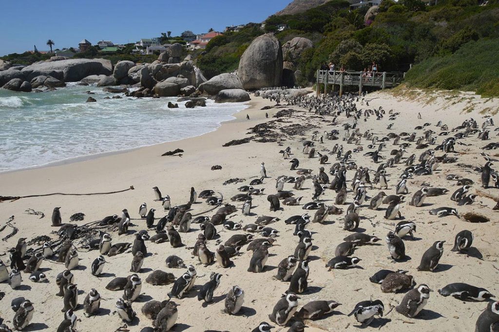 Nächstes Ziel unserer Reise: Simons’s Town, südlich von Kapstadt. Von Hermanus aus fahren wir den längeren Weg auf der Küstenstraße, auch hier immer wieder landschaftliche Highlights, die wir auch für kurze Stops nutzen. In Bettys Bay beobachten wir am Strand eine Pinguine-Kolonie, auch an den bunten Badehäusern von Muizenburg kommen wir vorbei. In Simon’s Town angekommen, beziehen wir unsere Unterkunft im A Boat House (wirklich schick und komfortabel) mit einem tollen Blick über das Meer. Abends geht’s zu Fuß runter in den Ort und im Hafen gehen wir ins Bertha’s Restaurant. Am nächsten morgen stehen dann, bevor es Richtung Kapstadt geht, noch der berühmte Boulders Beach mit seinen Pinguinen auf dem Programm und natürlich ein Besuch ganz im Süden am Kap der Guten Hoffnung.